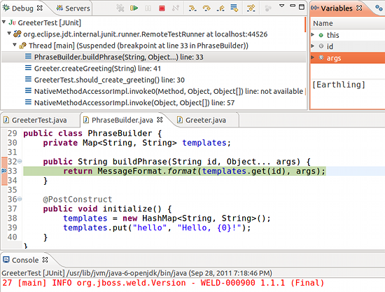 You’ve now run the same test on two different embedded containers, a CDI container (Weld) and a Java EE container (GlassFish). Both of these executions are in process. To really be sure the component works in a pure environment, we need to use a standalone container. Let’s switch to using JBoss AS.