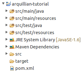 This command generated a Maven-based Java project inside the current directory in a new folder named arquillian-tutorial. Switch to that directory. The file structure of the project is shown below.