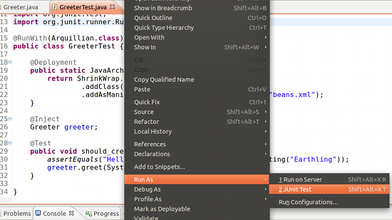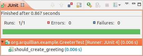 That’s the same test, this time running in a full Java EE container. Arquillian packages the test, deploys to the container as a Java EE archive, executes the tests remotely, captures the results and feeds them back to the Eclipse JUnit result view (or in the Maven surefire results).