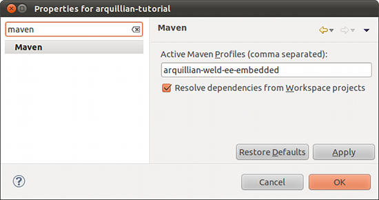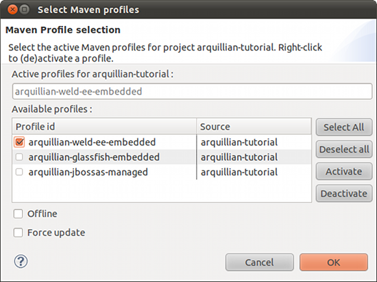 If you set the Weld EE Embedded profile to be active by default, you have to explicitly disable it to use another profile. You can disable a profile in the Maven Profile selector by right clicking on the entry and selecting Deactivate from the context menu. You’ll see this prefixes the profile name with an exclamation mark (e.g., !arquillian-weld-ee-embedded). Multiple profile selections (or deactivations) are separated by commas.