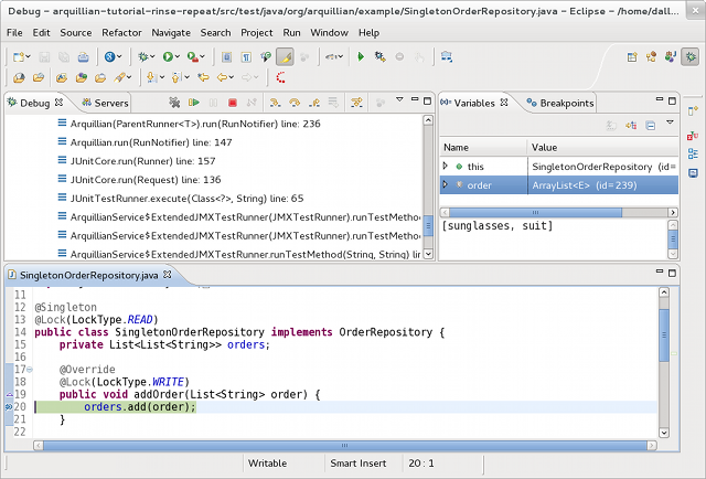 package org.arquillian.example;import java.util.ArrayList; import java.util.Collections; import java.util.List;import javax.annotation.PostConstruct; import javax.ejb.Lock; import javax.ejb.LockType; import javax.ejb.Singleton;@Singleton @Lock(LockType.READ) public class SingletonOrderRepository implements OrderRepository { private List<List<String>> orders;@Override @Lock(LockType.WRITE) public void addOrder(List<String> order) { orders.add(order); }@Override public List<List<String>> getOrders() { return Collections.unmodifiableList(orders); }@Override public int getOrderCount() { return orders.size(); }@PostConstruct void initialize() { orders = new ArrayList<List<String>>(); } }