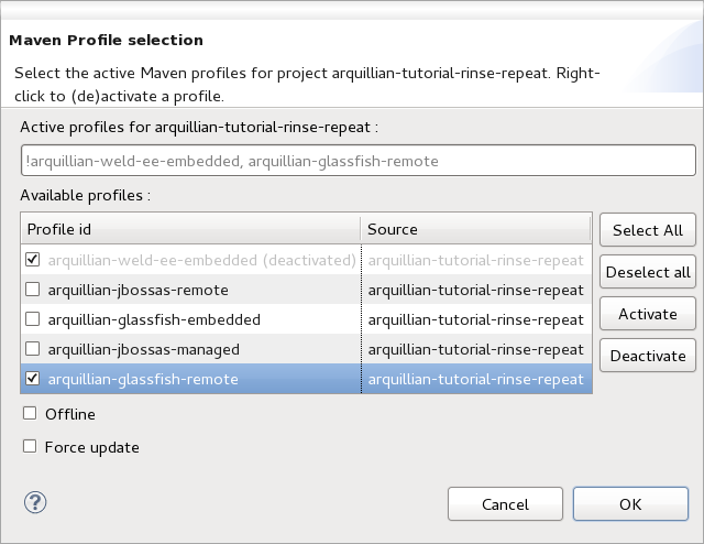 一旦服务器已经启动并处于运行状态,可以在 Maven properties 标签中或 JBoss Tools Maven profile selector 中激活 arquillian-glassfish-remote Maven profile。请记住一定解除 arquillian-jbossas-remote profile。下面的 Profile 编辑器显示正确的选择结果。