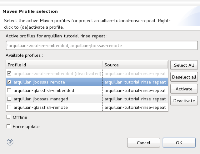 一旦服务器已经启动并处于运行状态,可以在 Maven properties 标签中或 JBoss Tools Maven profile selector 中激活 arquillian-jbossas-remote Maven profile ,下面的 Profile 编辑器显示正确的选择结果。