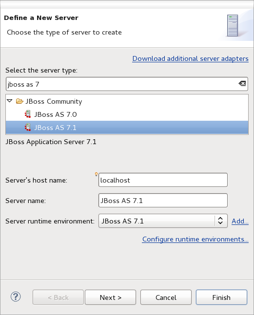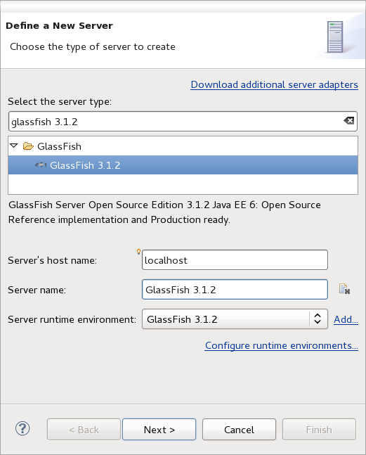 在 Eclipse 中,从主菜单中选择 Window > Show View > Servers 。当视图打开后,右击空白处并选择 New > Server 。你将要定义一个 JBoss AS 7 服务器,一个GlassFish 3.1 服务器。对于 JBoss AS 7,创建向导面板要求你事先已经下载好了一份 JBoss AS 并解压到硬盘。 GlassFish 3.1 向导面板则提供一个选项,可以自动帮你下载。